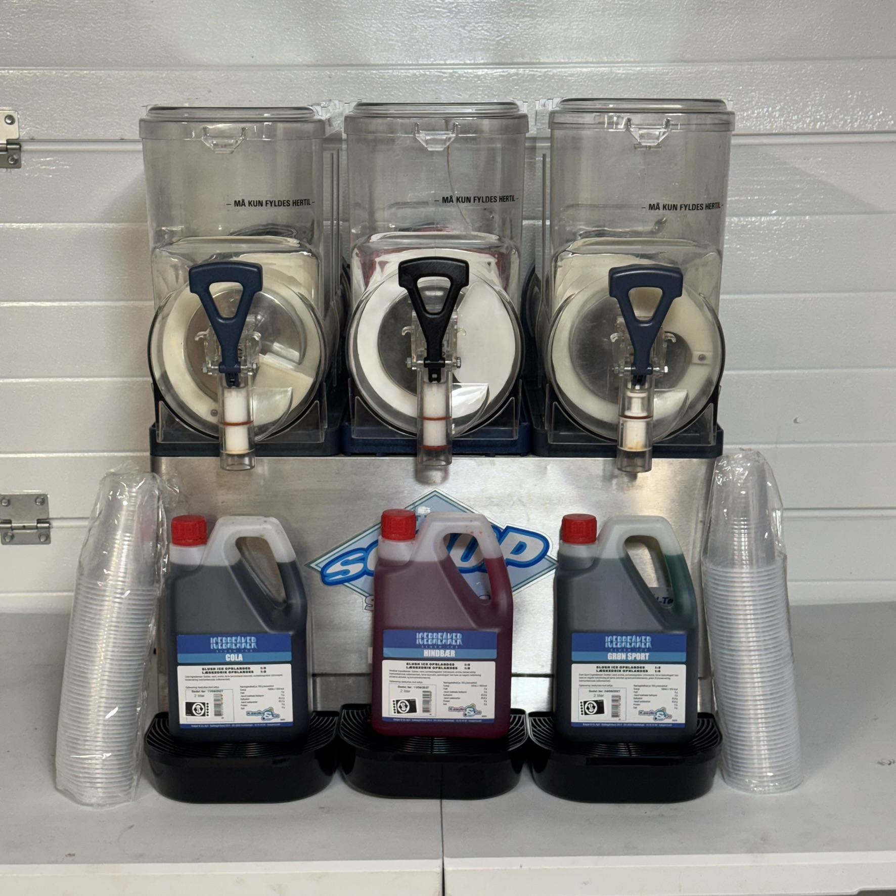 – Saft nok til 30 Liter Slush Ice (Hindbær, Blue Ice, Cola og Grøn Sport)
